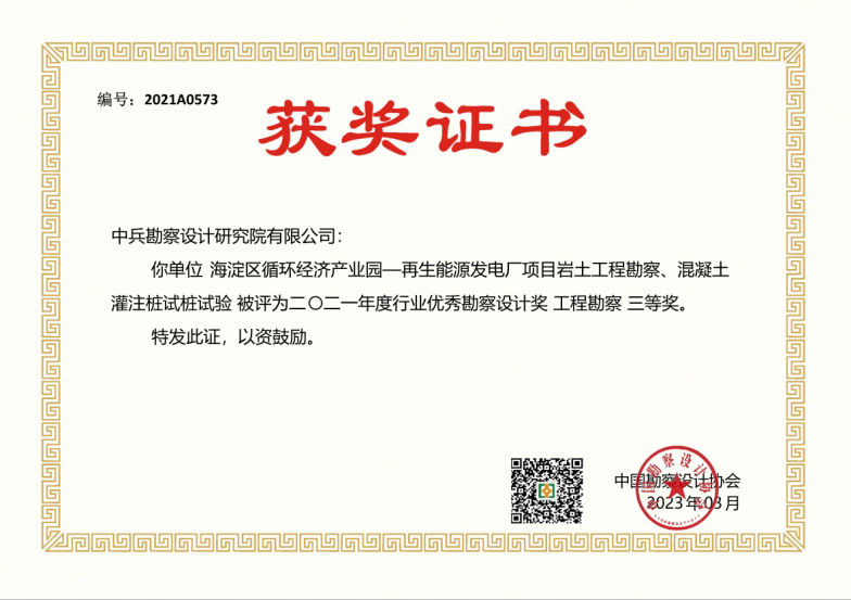 海淀區(qū)循環(huán)經(jīng)濟(jì)產(chǎn)業(yè)園—再生能源發(fā)電廠項(xiàng)目巖土工程勘察、混凝土灌注樁試樁試驗(yàn)項(xiàng)目榮獲三等獎(jiǎng)