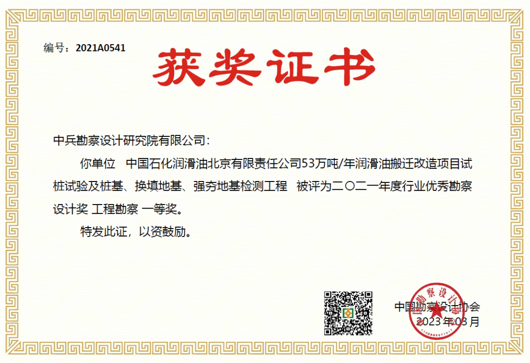 中國(guó)石化潤(rùn)滑油北京有限責(zé)任公司53萬(wàn)噸/年潤(rùn)滑油搬遷改造項(xiàng)目試樁試驗(yàn)及樁基、換填地基、強(qiáng)夯地基檢測(cè)工程項(xiàng)目榮獲一等獎(jiǎng)