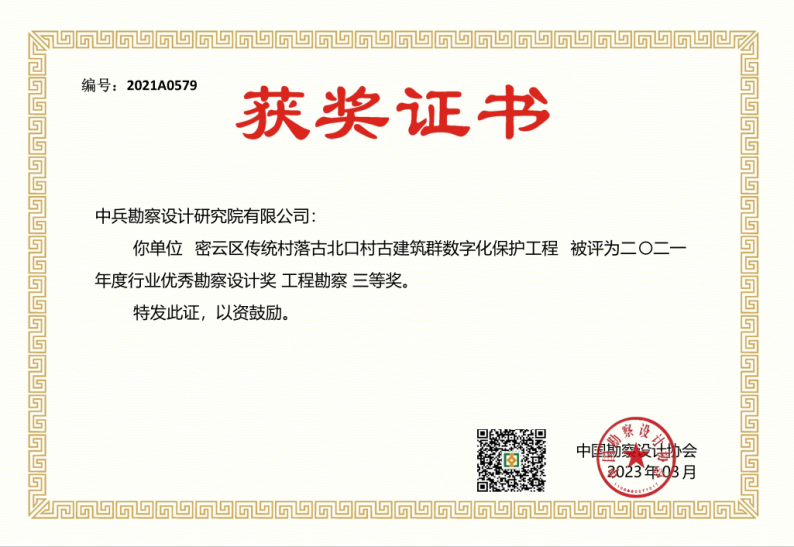 密云區(qū)傳統(tǒng)村落古北口村古建筑群數(shù)字化保護(hù)工程項(xiàng)目榮獲三等獎(jiǎng)
